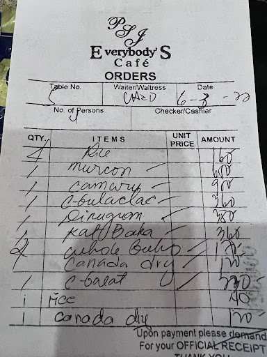 Read moreWe came for the famous Morcon to partake as part of our New Year Noche Buena and ended up eating at the place. Everybody's Cafe is an iconic place to go to for the traditional Capampangan Cuisine. After seeing the Tapang Kalabaw, Capampangan Kilayin and Beef Caldereta .... my husband and I decided to try, and they are all winners!! The Tapang Kalabaw is melt in your mouth with the slight sweetness, a hint of sourness and chewy texture was something unexpected not the typical Beef Tapa that I am used to. The Kilayin is like kilawin but cooked in vinegar and onions, the Beef Caldereta is the best with its tender juicy meat that has marblization that melts in your mouth, the sauce is ulam na!! It's a bit pricey but worth the taste!! The place is Carenderia style where you choose the viand that you like and they will cook it for you. We wanted to try the itik (Adobo or fried) but there is just me and my husband and serving is quite big portions. They have an air-conditioned dining area and the staff are helpful and friendly. We will...