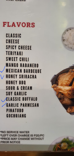 First, the serving time is so long that we can't even enjoy and savor the food. Whenever we dine here, we need to wait 15-20 minutes and sometimes 30 minutes before the next batch of chicken serving. Second, we are 7 people eating and we ordered different flavored wings, so expectantly we thought that we would at least taste one chicken of each flavor but rather, they served us 2-3 chicken wings each per flavor. How would you expect us to eat the flavors we wanted. Third, the quality of the chicken we had earlier was not giving. It was very chewy when supposedly it should be at least crispy right?? I can still taste the raw breading itself and most importantly, the wings was not cleaned and prepared very well as it still has feathers on it. Lastly, customer service. Yes, your staff tends to our concerns but they are not friendly unlike the staff from other chicken wings place we went to. They don't seem approachable and they look irritable when we were asking to have a refill.