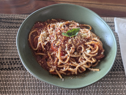 Kind and smiling staff Fast serving if they have your order Ambience is ok, no aircon, open air style Good presentation of the product I had the "special pasta" a homemade spaghetti with slow cooked tomato sauce. The spaghetti was self made yes and the sauce was also good not sour, like a standard sauce in a Italian restaurant in Europe, but the price is not worth the money also the portion was not that big for a woman it's enough. You not really taste the high quality it's an European standard pasta. A real home made spaghetti taste much more different in Europe. Here it's only more thick like the products in the supermarket. For this price I expected in Philippines something really special or even a bigger portion would me give a feeling of satisfaction but no. I also had the desert "Torta Al cioccolato" The taste was really good, the cake was warm and juicy and the vanilla ice was good. The portion was unhappily less for the price and I found something in the cake it's a no go, see below or the photos