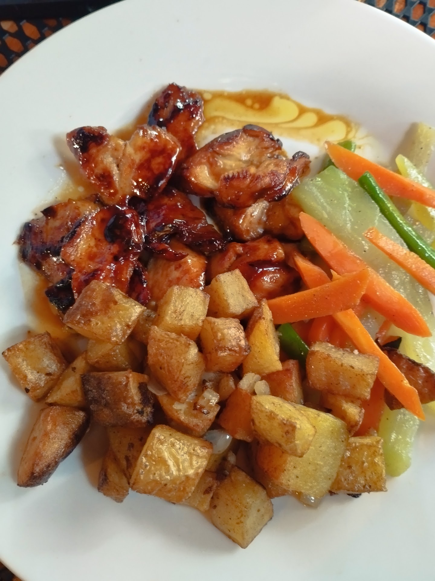 This time, I skipped the laminated menu and went straight to the special menu board. I ordered a pork kebab for myself and ginger chicken for my husband. He found his chicken dry. As a kebab enthusiast, I was hoping for roasted tomatoes and onions on my skewers—something I really love. Instead, I received three pale pork skewers with no tomatoes or onions in between.
