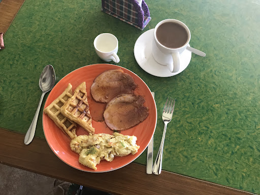 Read moreIt is voting day, today and opening time was 11:00AM. This is my first visit and arrived a little early. Maybe seven other people were waiting for the door to open...a good sign. It’s a pleasant and inviting, large space, I think upon entering. All of the employees are smiling, the aircon feels good and I choose a table by an window, overlooking the parking lot, rimmed with turquoise water. I got the suggested breakfast of waffles, sugar glazed ham, and omelette. A large mug of coffee is include in a 200P, only, price. The proper sized mug arrives half full...or empty. I told the waitress that is was a welcomed surprise to see such a mug, but would she mind filling it. With a smile, she obliged.it came with a generous sized cup of heated milk, as well. Ah, good coffee. A rare treat. The sugar glazed ham was good...and cold. The waffles were good...and tepid. The omelette was just right. I will return, most certainly, while I am in this town, but it’s something else I will order. Their good WiFi, I am using to post this. Did I say the...
