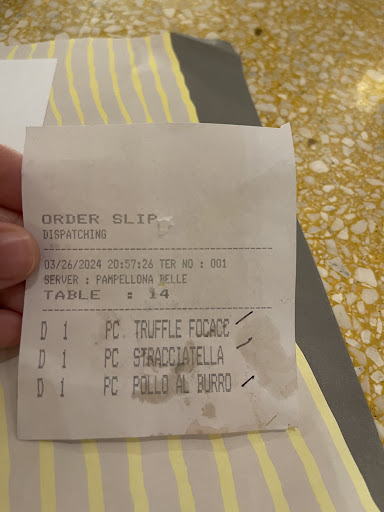 WORST dining experience ever at A Mano BGC last night. Hubby, daughter and I arrived at your restaurant roughly 15 minutes before 9PM (March 26, 2024). We were seated smack in the middle of the resto , with the pizza counter across us. Our orders were taken at 8:57pm by B. Pamplona (captain server). Orders were (1) pc Truffle Focc, (1) pc Stracciatella, and (1) pc Pollo Al Burro.