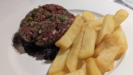 about the food: onion soup - was a good start to the meal together with the hot and fresh bread escargot - dont order this unless they've improved on their source and/or cleaning process. the seasoning of the snails couldnt hide the silty aftertaste. was so disappointing beef tartare - was really looking forward to this as reviews raved about it and I wasnt able to have tartare when I was in France so was craving it; sadly, the seasoning this time overpowered the beef. felt it had a tad too much capers and was too spicy/peppery for a tartare. the fries it came with were really good though: crispy without being overly oily grilled lamb loin - staff were so nice to accommodate our request for this to be served with roasted veggies as we already had potatoes with the tartare. the meat was cooked really well: tender with the perfect doneness & amount of crusting. veggies were really tasty too though some were a bit mushier than others compli dessert - as we were there for a celebration, staff gave us complimentary desserts: raspberry sorbet, cheesecake, and cream with a wafer. sorbet was really refreshing after all the savory food we ate while the cheesecake was creamy without being cloyingly sweet.