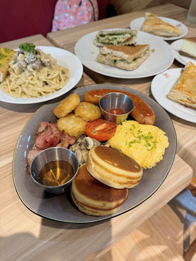 For our main, we couldnât resist the American Breakfast Sampler. Itâs got everythingâa hearty platter of eggs, bacon, sausage, toast, and more. Seriously, this is comfort food at its best! We also got the Creamy Mushroom Carbonara* which was rich and flavorful, loaded with mushrooms, and absolutely satisfying.