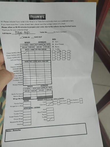 The place is surprisingly not too crowded during Sunday lunchtime. Probably because there's more crowd in Goto Tendon downstairs. I ordered spicy Buffalo wings with Blue Cheese dip and I must say, if you want something spicy you should order the very spicy. It's not as spicy as I want it to be. I like the ambiance of the place, they have trendy ceiling lights and wall paintings. As for the service, the crew is attentive and prompt. They accept credit/debit cards, which is a plus for me. Jun 26, 2020. I was so hungry and saw that they're open. Both entrance is available (the one for dine in customers and the one for GrabFood And Foodpanda) which gave an impression that the first door is for takeout/delivery while the other is for dine in. In fact, their forms have a checklist which gives an option if you wanna dine in or have it for takeout. Anyway, so I opted for dine in because I have errands to do and a takeout bag would be a hassle for me to lug around. I waited for my order and lo and behold, it's on a paper bag for takeout! I am happy with the fast service and the customer service, pero where would I eat this now? I avoided having confrontation with the staff, pero what the hell, place a signage na for delivery and take out pa lang din kayo!!! And don't put an option for dine in on your forms when you don't allow dine in. Of course di na yan machecheck ng cashier niyo kasi under the assumption sya na takeout lahat! Now my back is hurting because I have to place the brown bag in my backpack and I'm whining like a 3 year old because I haven't eaten and probably would have to buy food somewhere else that allows dine in. I know we're all adjusting to this new normal, but help us adjust.
