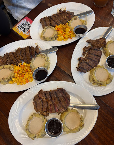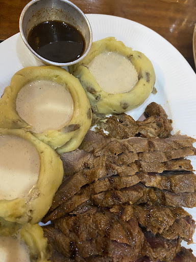 Their steak can come with 2 sides. We choose salad and mashed potatoes for sides. I also asked for the steak to be medium rare. The steak was well seasoned and charred from the grill. The meat was tender but not really crusty on the outside. It also had some tendons which i didnt like. My wife, didnt mind eating the tendons since she likes having that on cornbeef. It also came with some sour bbq sauce. I didn't need it since the steak was already quite flavorful. It wasnt amazing to be honest but for a price of only 500 with two sides, this is definitely a great deal!