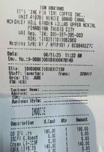 Read moreAs a Filipino-Canadian, I was a bit disappointed by the crew’s lack of familiarity with common Tim Hortons ordering terms. For example, when I mentioned the very common “double double,” the crew had no idea what it was. I think the training team could do a better job of educating staff on these standard terminologies to enhance the customer experience.