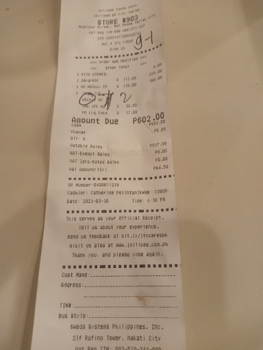 Update as of March 31, 2023 Service crew are in a rush to get the dinning area cleaned at around 6:35pm. They are in a rush of closing the store cinsidering there are still customers who are eating their meal and ordering their food (nagmamadali atang umuwi mga crew noong araw na iyon). We ordered 2 Jolly Hotdogs together with other food (based on our receipt) and we were told that our order will be ready within 12 minutes to 15 minutes (6:36pm). 30 minutes had passed but no orders came. We went to the counter to follow up our order, to our surprise they forgot our food 😂🤣 and waited for another 12 minutes. Cashier blaming the Product Controller (PC), PC claiming that he did'nt received any order, and the manager just playing dumb 🤭😂🤣 on the situation. Anyway, we just enjoyed our food knowing that if you complained and blew your temper they will put a "special order" in your food 🤮🤢 in these kind of...