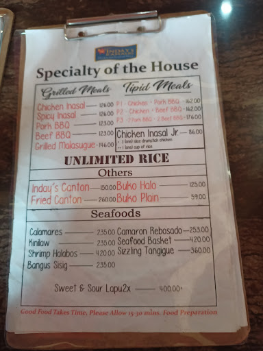Read moreWhile strolling around Valencia we chose to eat at Indays Kamalig we tried their chicken inasal and barbeque is good but a little dry for my liking, The price is a bit pricey but its ok place needs a little improvement, clean Restrooms and staff are attentive quick and friendly and i would like to try out some other food on the menu if i were...