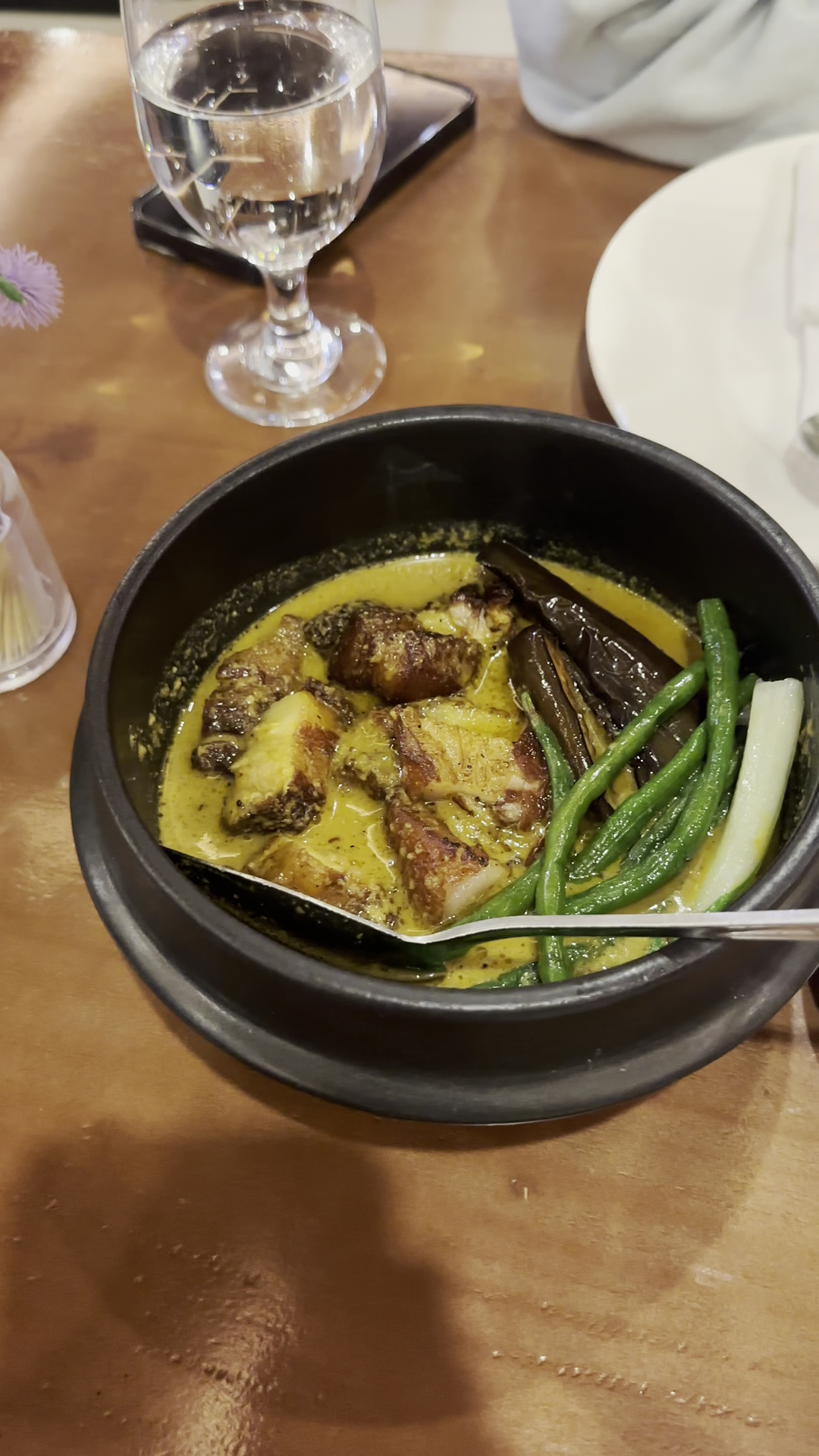 We ordered the Wing Nutz and the Crispy Kare Kare. The wings were a standout, offering a generous portion of 12 pieces with five different flavors. Perfect for sharing, the wings were crispy and flavorful, though the sauces leaned a bit heavy at times, which could feel overwhelming. The Crispy Kare Kare was a delightful twist on a classic dish, featuring a unique smoky or charred flavor that added depth to the dish. While the sauce was thinner than traditional Kare Kare, it was still bold and complemented the perfectly cooked vegetables like eggplant and asparagus. The fried pork belly was crispy and delicious, but many of the cuts were overly fatty, which detracted slightly from the experience.