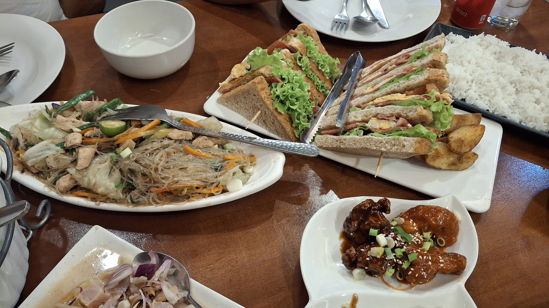 Food: Their food are flavorful, perfectly balanced, and aren't made on a budget. Their serving portions compensate the added price. We ordered 5 dishes (check photos), platter of rice, and 2 Halo-halos for the price of around 2.5kPhp. This place also serves steaks, wine, and other expensive food items you can definitely check out. You'll definitely get what you pay for. Trust me. Recos: Chicken Nuts, Clubhouse sandwich (Best), Pancit Guisado, Sinuglaw. Avoid: Bangus Sinigang (small portion), Fried Chicken (Thick Batter)