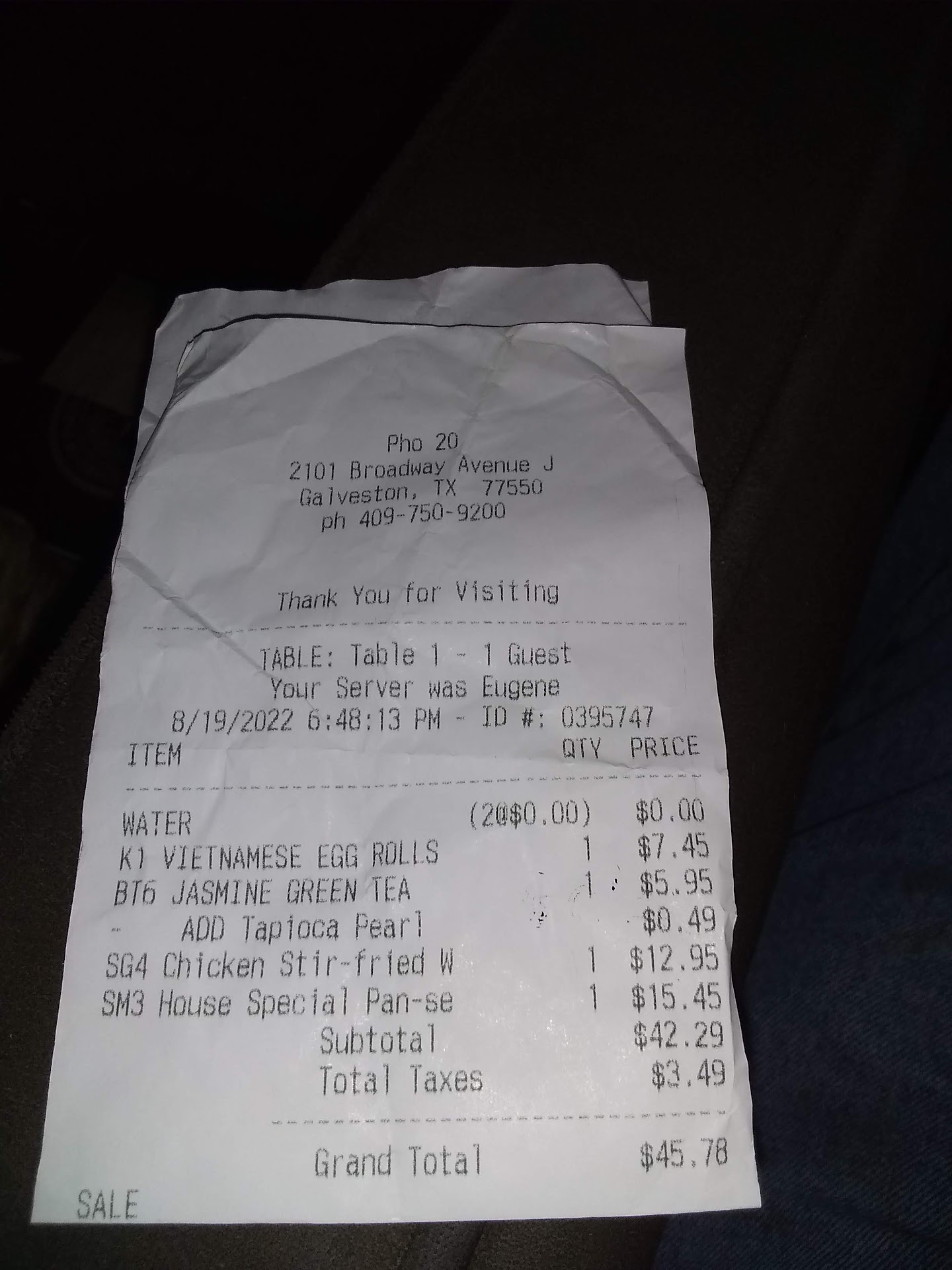 Read moreAt the Pho 20 restaurant, as we were gearing up to stay at an Airbnb before taking an Uber to our cruise, we received an incorrect order from a server. In a rush, we didn't check the order until the next day, only to find out that, as vegans, we had received a beef dish instead of the vegetarian meal we requested. We had eaten at Pho 20, and the incorrect order was one of two orders of Lemongrass Tofu with Chilli Pepper and Broccoli combined with Mixed Vegetables and Vermicelli Noodles as the side. This had been a to-go order. We snapped a photo of the wrong order but couldn't contact the restaurant until after our cruise, given they opened at 11:00 a.m. and our departure for the cruise was earlier. When we finally reached out, after our cruise had ended, the restaurant's response was disappointing. We had to take a shuttle from Galveston to Houston, so we had no way to revisit Pho 20. The person on the phone offered to remake the order, a solution which any one would immediately see as impractical since I was already at the Houston Airport, miles away from the Galveston. They also proposed correcting the order on our next visit, despite us residing out of state, and astonishingly mentioned firing the employee responsible for the error instead of issuing a refund. Even though the service from the waitress had been commendable and I had tipped well, the management's approach to rectifying the mistake was neither professional nor customer-centric. She kept mentioning firing the waitress when we merely wanted a good faith solution to our situation. This incident has compelled me to give a poor review of this establishment due to their appalling customer service, which could undoubtedly sour the start...
