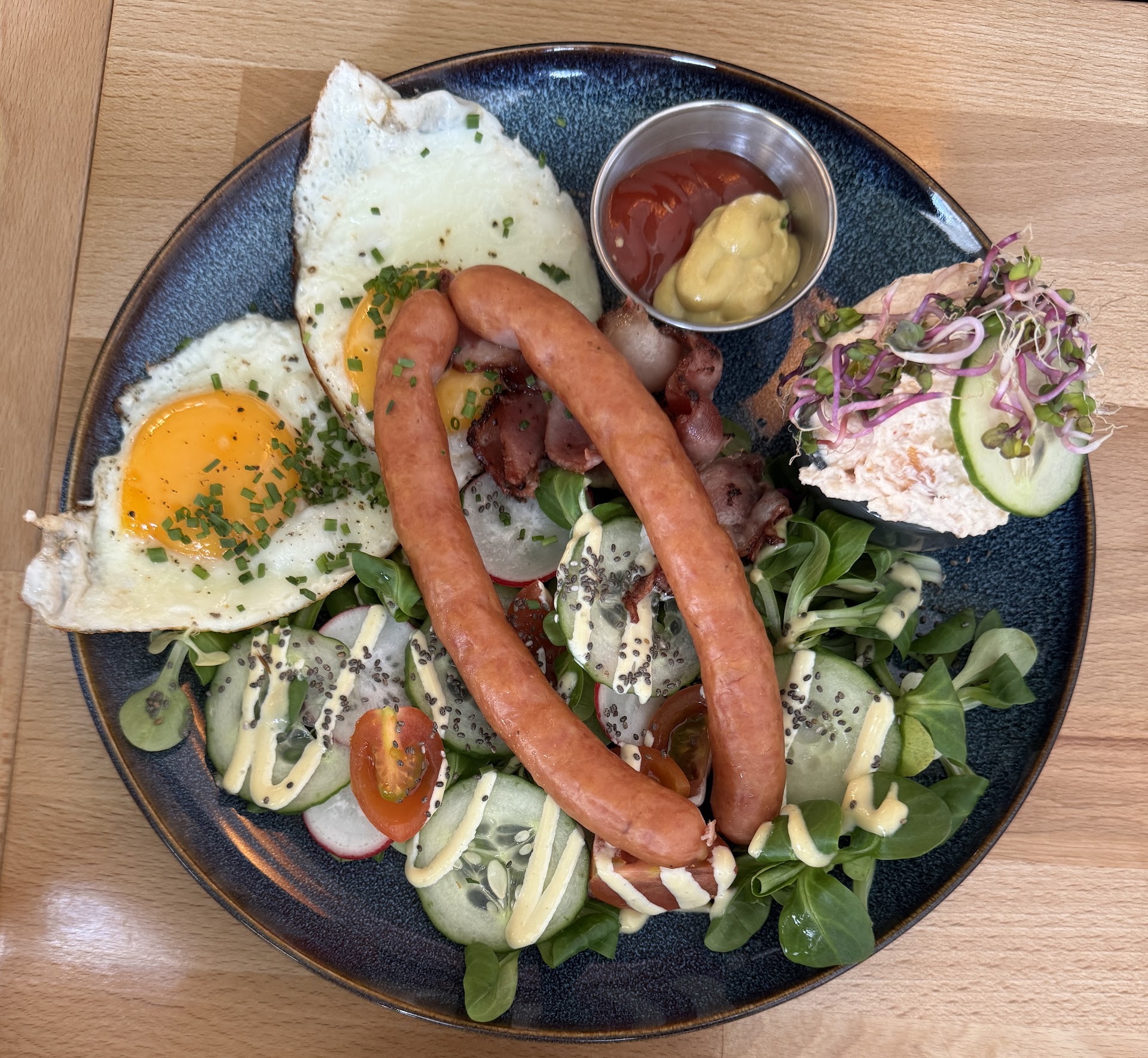 One of the highlights is the cottage cheese, which pairs wonderfully with the fresh little salad it comes with — light, refreshing, and satisfying. The scrambled eggs are another standout: perfectly seasoned, moist, and full of flavor. The addition of sun-dried tomatoes and spinach makes for an excellent combination, adding both texture and depth to the dish.