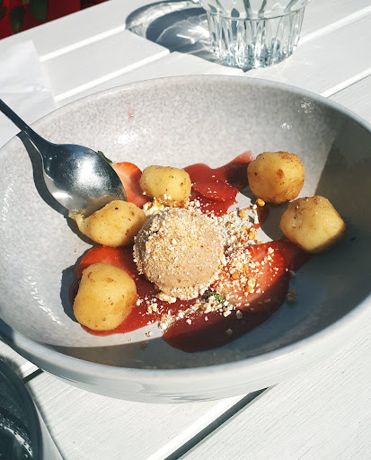 Read moreZacznijmy od jedzenia. Odwiedziłem ten lokal z okazji Restaurant Week, zamówiłem z dziewczyną oba dostępne menu - mięsne i vege (chlebowiec ;) ). Do niczego nie można się przyczepić. 1) krem z dymki - pyszny, bardzo aromatyczny, ciekawie połączony z podpłomykiem z mangowym musem. 2) Polędwiczka wieprzowa sous-vide + krokiet + dodatki typu burak, seler naciowy - również super, porcja większa niż się spodziewałem, krokiet, mimo smażenia, nie tłusty, zrobiony z szarpanej wieprzowiny. Dodatki celne. 3) chlebowiec - to cos mega oryginalnego, wygląda jak mięso. Smakowo - cóż, mało wyrazisty, na szczęście podany z sałatami i sosem vinegrette oraz malinami, co pozwoliło mocno wzbogacić jego smak. Ładne jajko marmurkowe. 4) deser - ciastko z musem z twarogu z malinami. Po dwóch poprzednich daniach deser wcale nie był wymagany, najedliśmy się naprawdę porządnie, więc szczęśliwie deser był dość lekki, podany z jagodami i malinowym musem, którego cierpkość sprawiała, że był jeszcze lżejszy.