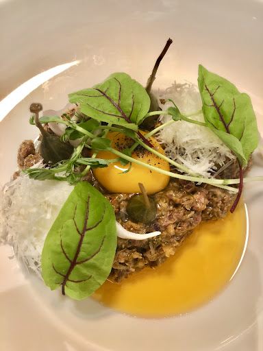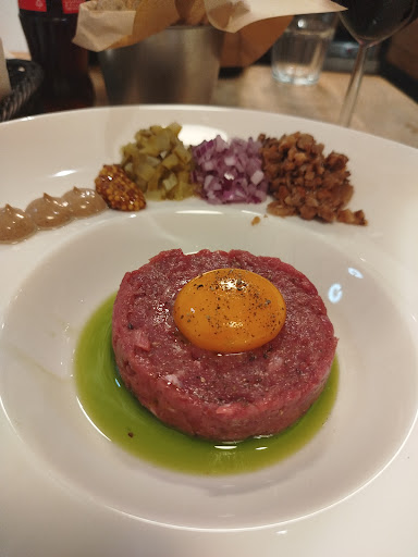 Karta ma bogaty wybòr tatara, którego mozna modyfikowac wedug swoich wlasnych upodoban. Tatar ktory zamowilem (wloski) z parmezanem i bez anchovis (bo nie lubie) przyszedl bardzo szybko -/+ 5 minut. W srodku byly 3 stoliki zajete, ale w lokalu obok (ramki) mozna zamowic tatara z tej samej kuchni i kiedy czekalismy to 3 stoliki z tamtad zostaly obsluzone, co swiadczy o dobrej organizacji kuchni. Tatar przyprawiony doskonale, nie wymagal dodania ani soli ani pieprzu. Idealna wrecz kwasowosc i wilgotnosc miesa, jednak kolor nie przypomina koloru miesa. Mieso bylo blade i wygladalo bardzo malo apetycznie. Chleb przyszedl bardzo twardy, a maslo bylo zamrozone i w zasreberkowanych kostkach (sic!)