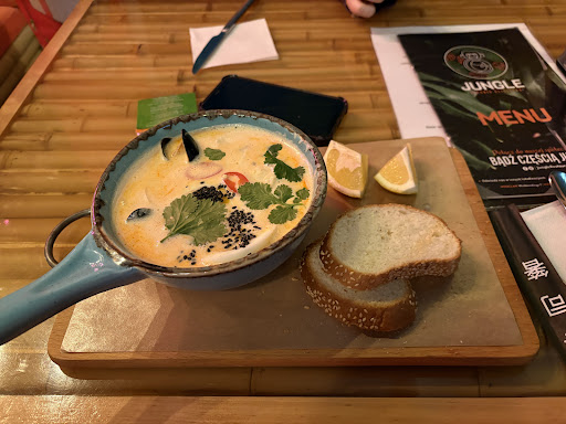Read moreNiedawno odebraliśmy zamówienie z Jungle dostarczane na wynos do domu. Niestety muszę stwierdzić, ze posiłek w restauracji a „pudełkowe” to dwie różne bajki. Jungle skradło moje serce pod względem świetnego klimatu, smacznych drinków i pysznych, orientalnych smaków. Tak jest w przypadku jedzenia na miejscu. Co otrzymujemy podczas dostawy? Za pierwszym razem jedzenie zostało Nam dostarczone po uwaga 4 godzinach. Kierowca zamiast do Nas, dzwonił dzwonkiem do drzwi sąsiadów. Kiedy powiadomili dostawce, ze nie zamawiali jedzenia, pojechał z powrotem do restauracji. Tak właśnie spędziliśmy walentynki-czekając pół dnia na obiad. Duży plus dla obsługi za ponowne przyszykowanie dan i dostarczenie oraz opłatę całego zamówienia w ramach rekompensaty. Podczas mojego drugiego zamówienia jedzenia do pracy- kolega dostał inne danie aniżeli zamawiał oraz zabrakło sosów, które zakupił. Myśle sobie „do trzech razy sztuka”. Dzisiaj zamówiliśmy ponownie Jungle z moim ulubionym Pad Sew. Pan przez telefon poinformował mnie o 1h/1,5h oczekiwania na zamówienie na wynos. Czekaliśmy prawie 2h. Jedzenie przyszło lekko wystygnięte, ale myśle co tam, ważne żeby smakowało. Niestety kolejny zawód. Makaron jest na pół surowy. Nie da się go pogryźć, jest po prostu twardy. Pół Dania zostało wyrzucone do smieci. Bedac stacjonarnie w Jungle nigdy mi się to nie przytrafiło. Kurczak smaczny, jednak niektóre kawałki wydawały się jakby surowe, niedopieczone. Jako klient, który stosunkowo czesto wybiera Jungle jako fajna miejscówkę na spotkania ze znajomymi, z dobrym jedzonkiem i miła obsługa- po raz kolejny się zawiodłam. Ostatni raz zamawiam na wynos. Wybiorę inna, sprawdzona restauracje. Przykre jest to, ze klienci zamawiający na wynos są mniej doceniani od tych, którzy przychodzą do restauracji. Śmiem twierdzić, ze kucharze starają się dużo mniej szykując Dania z dowozem. Tym bardziej, ze płacimy nawet więcej, kupując na wynos. Jeśli Jungle-to...