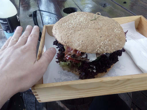 Lokal zasługuje na wstępie na plus za godziny otwarcia, w niedzielę do 21. Usytuowany w odnowionym, starym dworcu kolejowym wciąż czynnym co ważne i nie oczywiste na Dolnym Śląsku. W menu dominują burgery i panckaki. Są też sałatki i na jedną z nich się skusiłem - "Milano" z sosem musztardowo - miodowym, która okazała się naprawdę niezła, z dużą ilością pestek dyni, kiełków, pomidorkami koktajlowymi,.kurczakiem (Na ciepło !) itp. Niestety co do piw to są tylko bezalkoholowe i do 1% zawartości alk. więc trochę średnio. Ale lokal gustownie urządzony z kelnerkami poprzebieranymi w śmieszne stroje trochę retro. Ogólnie można wpaść na burgera lub sałatkę i to drugie mogę...