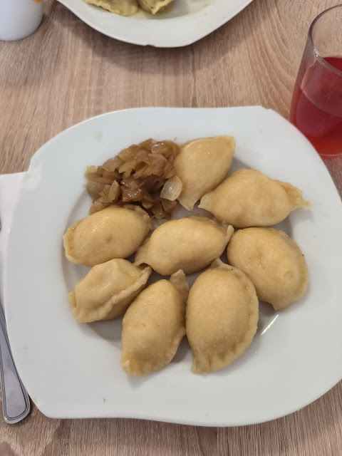 Ziemlich nah an der Stadtfähre steht eine Gebäude die von außen an die sozialistische Handelsvergangenheit des Landes erinnert. Früher war es wohl ein Laden, heute ein Bistro. Mir würde es von einem einheimischen Bekannten empfohlen mal dort zu essen. "Die haben die besten Piroggen in der Stadt", meinte er. Okay. Dann probieren wir Mal die.... Eine helle Kaufhalle, verglaste Küche, rechts ein Tresen wie im Laden und da hinten ein Regal voll Honigglaser. Man fühlt sich gleich wie bei Oma ;) Hinter einer Glasscheibe steht ein mit etwas beschäftigter Mann und zeigt kaum Interesse an den Kunden. "Okay" denke ich mir, womöglich soll das eben so wirken, wie früher im Milchbar, als eine voluminöse Köchin mit einer riesen Kochkele dem Kunden eine Portion undefinierter "Mumpe" auf dem Teller platzierte? Die Auswahl an Piroggen ist eher durchschnittlich. In Stettin hatte ich länger überlegen müssen. Schließlich liebäugle ich der Mexikanischer Variante, aber Frage den Verkäufer noch Mal, was da drin ist. "Etwas pikant aber essbar", sagt er. Damit ist das Gespräch beendet. Er kehrt zu seinem Handy, ich zu der Auswahl. Am Ende bestelle ich doch die Mexikaner bei dem etwas gelangweilten Kassierer und gehe mir einen Tisch zu suchen. Die Auswahl ist an sich gross - runde und quadratische Tische laden freundlich ein. Nur, wenn die noch sauber waren... Sind sie nicht. Schließlich finde ich ein Tisch der etwas weniger befleckt im Leuchtstoffröhrenlicht freundlich mit ein paar Spritzer Barszcz blinzelt. Glücklich über dem "Fund" setzte ich mich hin und warte. Immer wieder ertönt ein Signal im Saal und irgendeiner der Kunden geht zu Ausgabe. Schließlich, nach einer halben Stunde bimmelt auch mein Pipper und ich geh, hungrig wie ein Wolf, mein Essen an der Ausgabe abholen. Spärlich informiert mich die Köchin welche Portion was beinhaltet (wir sind hier zu zweit essen) und verschwinden hinter der dicken Glassscheibe. "Na endlich!", freue ich mich im Geiste und eile mit den Tellern zum Tisch. Schnell holle ich noch das fleckige Besteck aus dem Kasten in dem schon zig Kunden an dem Tag ihre Finger tauchten, zwei dünne Papierservietten und setzte mich hin. Der Barszcz (Rote-Bette Brühe), den ich mir dazu bestellt habe schmeckt etwas faade. Für 5zl etwas enttäuschend. Die Piroggen dagegen sind lecker. Dünner Teig, die Fühlung ist gut, aber nicht zu sehr gewürzt und schmeckt wirklich ein wenig mexikanisch. Mein Begleiter kaut an der "ukrainischen" Variante, wie seit einiger Zeit die früheren Russischen Piroggen heissen, ohne Überzeugung. "Irgendwie schmeckten die bei Mama früher besser", meint er. "Früher war angeblich alles besser, auch der Barszcz", erwidere ich und stehe von dem Tisch, den auf den Platz warten bereits einige, hungrige Kunden. Ob ich hier noch Mal essen werde? Eher nicht. Es gibt auch andere Orte in der Stadt an den man gut essen kann, wenn auch vermutlich nicht so günstig. Die wollen auch ausprobiert...