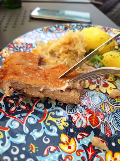 Der Höhepunkt des Abends war aber natürlich das Essen: Wir haben alle das Schnitzel bestellt – und was sollen wir sagen? Es war auf den Punkt perfekt! Außen goldbraun und herrlich knusprig, innen wunderbar zart und saftig. Dazu gab es hausgemachte Beilagen, die super abgestimmt waren – insbesondere die Bratkartoffeln und der Gurkensalat waren ein Traum. Man schmeckt einfach, dass hier mit viel Liebe und Können gekocht wird.