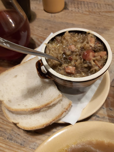 A na Boga — jesteśmy w Łodzi, gdzie otacza nas kultura łowicka, sieradzka, łęczycka, piotrkowska, opoczyńska. Tyle zmarnowanego potencjału, a uciekamy gdzieś ni to w góry, ni w Kraków. Jedzenie też zupełnie nieregionalne — placki ziemniaczane z gulaszem były okropne, po prostu mdłe, nie dało się ich jeść. Mięso i sos były dobre. Bigos natomiast zmielony na brązową papkę — więcej tam przypraw niż mięsa i kapusty.