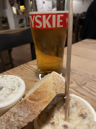 The place is loud. Guests screaming (and it was not even that crowded) and music is competing with people trying to talk. Menu is large and hard to read due to some style choices for names and font. Food is ok, not amazing, mostly traditional Polish without any extra spark. It is traditional but not old Polish. Rather something that mom or grandma would cook for dinner with some starters from bar. If someone os visiting Poland and has not much experience with Polis cuisine - it will work. For people brought up on those dishes it may be bland. Complementary piece of bread with cottage cheese or lard lacks a sour cucumber. Bigos is slightly less on the sour side and more on the sweet, zraz overcooked etc. Asked about how each dish is waitress will tell that it is very tasty but will not describe, needs additional questions if you care about something specific. They are nice to you and helpful but two steps from your table (the socializing spot is apparently next to the bar) they are complaining about customers and bragging how they got back on them and this, somehow goes over the music. Imagine that: "And someone was not nice so I left them to wait half an hour on service, hahaha". Feel threatened yet? Careful you customer! Drinks in the menu look very innovative but reading ingredients you will notice that those are all classics with made up names. From all over the world. I can recommend Harmas, mulled wine with spirit - this one will come in burning and is something unique. Karczma does not seem to know if they are a pub with food or a family place, guess they welcome everyone but instead of welcoming atmosphere it turns out chaotic.