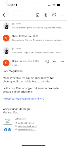 Zamówione kubki na sklepie online . Jeden z nich został odesłany z prośbą o zwrot . Sklep odesłał kwotę pomniejszoną o UWAGA 13 zł twierdząc że ich UWAGA kancelaria prawna tak im powiedziała … Po 1 w regulaminie nie ma takich informacji . Po drugie .. ludzie 13 zł ? Naprawdę ? Kupujemy sporo kawy i nawet się cieszyliśmy że w końcu jakiś nowy fajny sklep się trafił . Ale jak ktoś dla 13 zł wysyła wiązankę od prawników swoim klienta to nie chce mieć z tymi ludźmi nic wspólnego . 13 zł 🤡🫶🏻 Edit: Państwo sobie chyba żartują pisząc że zapłacili za zwrot z własnej kieszeni! Sama zapłaciłam za przesyłkę zwrotną . Mało tego w meilu napisaliście że zwrócicie całość za kubek i że się „źle zrozumieliśmy „ po czym przy zwrocie jednak zasłaniając się jakimiś wymyślonymi kancelariami postanowiliście pomniejszyć kwotę o koszt dostawy. Obrażacie mnie Państwo i kłamiecie !