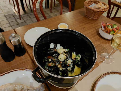 The reviews are true, one of the best service I've gotten not just in Gdansk but throughout Poland. We were actually served by 3 host/waiter/waitress in total, I'm not sure why. The host was very charming and welcoming! Would go back just for the service A+ however the food was also amazing! We wanted to try some seafood being by the coast, and they recommended the Polish White Wine, which was like a sauvignon blanc but just a hint of sweetness, very refreshing. That paired really well with the Calimari for appetizer and the Halibut for the main courses. Ended up with a couple more glasses of white wine before the end of the night. The weather was also nice out to sit outside this time of year and see the boats and tourists pass by and the sunset. If I could give it three A+ or three 5 stars I would. But the best compliment I can give is I plan to go back 2x this trip and try the different dishes and I will be back again next trip as well. Update: I did go back and tried the chicken main dish the following week and it was...