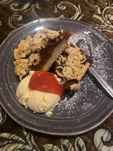 There was a guy playing piano songs occasionally and then joining his group of friends, and a dog barking customers but a quiet friendly one.