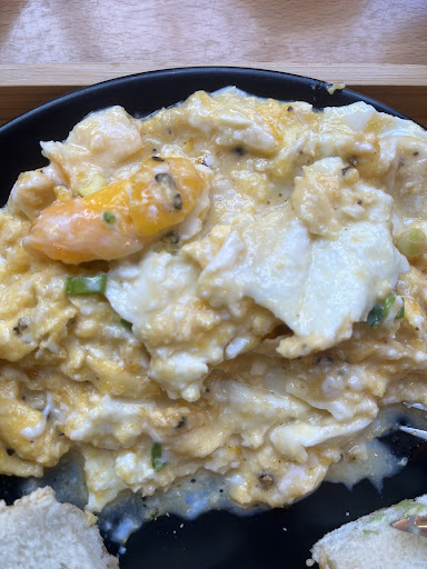 Zobaczyłam opinie oraz zdjęcia i zdecydowałam przyjść na śniadanie. Zamówiłam kawę, herbatę i 2 śniadanka. Kawa ogólnie była w porządku, ale mleko było przegrzane, trzeba było odczekać parę minut, żeby można było się napić. Jeżeli chodzi o czas oczekiwania to przy składaniu zamówienia zostałam poinformowana, że to będzie ok 25 min, nie mam z tym problemu, jest weekend, duży ruch i to rozumiem. Stolik obok, który zamówił chwilę później otrzymał śniadania i zdążyli to zjeść, minęło jeszcze z 15 min i dopiero wtedy dostałyśmy nasze śniadanie. Czyli łączny czas oczekiwania na śniadanie wynosi ponad 40 min. Przed złożeniem zamówienia sprawdziłam jak wygląda podana jajecznica i była to kremowa dobrze wymieszana jajecznica. Dołączam też zdjęcia które znalazłam na Google oraz instagramie razem z rzeczywistością którą dostałam, czyli nie wymieszane, w niektórych miejscach na twardo żółtko, a w niektórych nie wiem w jaki sposób ale surowe jajko i do tego nazwałabym to danie pieprz z jajecznicą, całkiem duże kawałki pieprzu nie da się ominąć przy jedzeniu. Jeszcze ciekawym punktem w tym lokalu są przygotowane sztućce, zawinięte w serwetki i sklejone mokrymi rękami. Wygląda to szczerze mówiąc obrzydliwie, co było powiedziane obsłudze, na co dostałyśmy odpowiedź, że tak ma być. Moim zdaniem można ułożyć serwetkę ze śtućcami w inny sposób nie sklejając to woda, po czym wszystko jest mokre i serwetka wygląda jakby była przerzutka parę razy i nawet używana wielokrotnie.