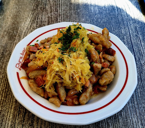 Read moreMiejsce naprawdę warte odwiedzin, miła obsługa i to naprawdę zasługuje na mega wyróżnienie tego miejsca bo mają co robić a podejście do klienta że czujesz sie miło widziany❤️❤️❤️jedzonko pyszności👍ale kluski szare poezja ten boczek mmmmm i do tego wszystkiego wisienka na torcie kapusta Wooow 👌🥰 Edit.po roku odwiedzamy pyre i troszkę a nawet bardziej jak troszkę zawód . Ale od początku zamawiamy kluski szare w lokalu pusto czekamy spory czas obsługa wychodzi na zewnątrz coś tam robiąc przy stolikach wydaje sie ze troszkę za długo z tym czasem oczekiwania wchodzimy do lokalu zapytać nasze ( lub nie nasze 🙈) kluski stoją i czekają ale nie ma ich kto zabrać po chwili oczekiwania są i nasze kluski ale widać ze to nie był dzień pani która je podawała ewidentnie prawdę mówiąc mogła nas zawołać żebyśmy sobie sami je odebrali niż stawiać na drugim końcu stolika w sposób taki że dziecko zrozumie intencję Masz i Ż......🙈 ale ok czekaliśmy rok żeby je zjeść puszczamy to bokiem każdy ma zły dzień. I tu oliwy do ognia dolewa danie nasze wyczekiwane danie Szare ale Jare 😭 które nie za bardzo są Jare a wręcz Oliwiane od tłuszczu z duszonej cebuli i ogólnie jakiegoś kolorowego tłuszczu, kapusta od razu poszła w chusteczkę i do kosza smak nie taki jak kiedyś wręcz całkowicie nie trafiający w nasze kubki smakowe( ostatnie zdjęcie to właśnie z tej wizyty)No cóż nie będziemy juz wracać z wielką chęcią i smakiem może kiedyś...... ( zostawiam 2 gwiazdki ze względu na wizytę w tamtym roku gdzie wszystko...