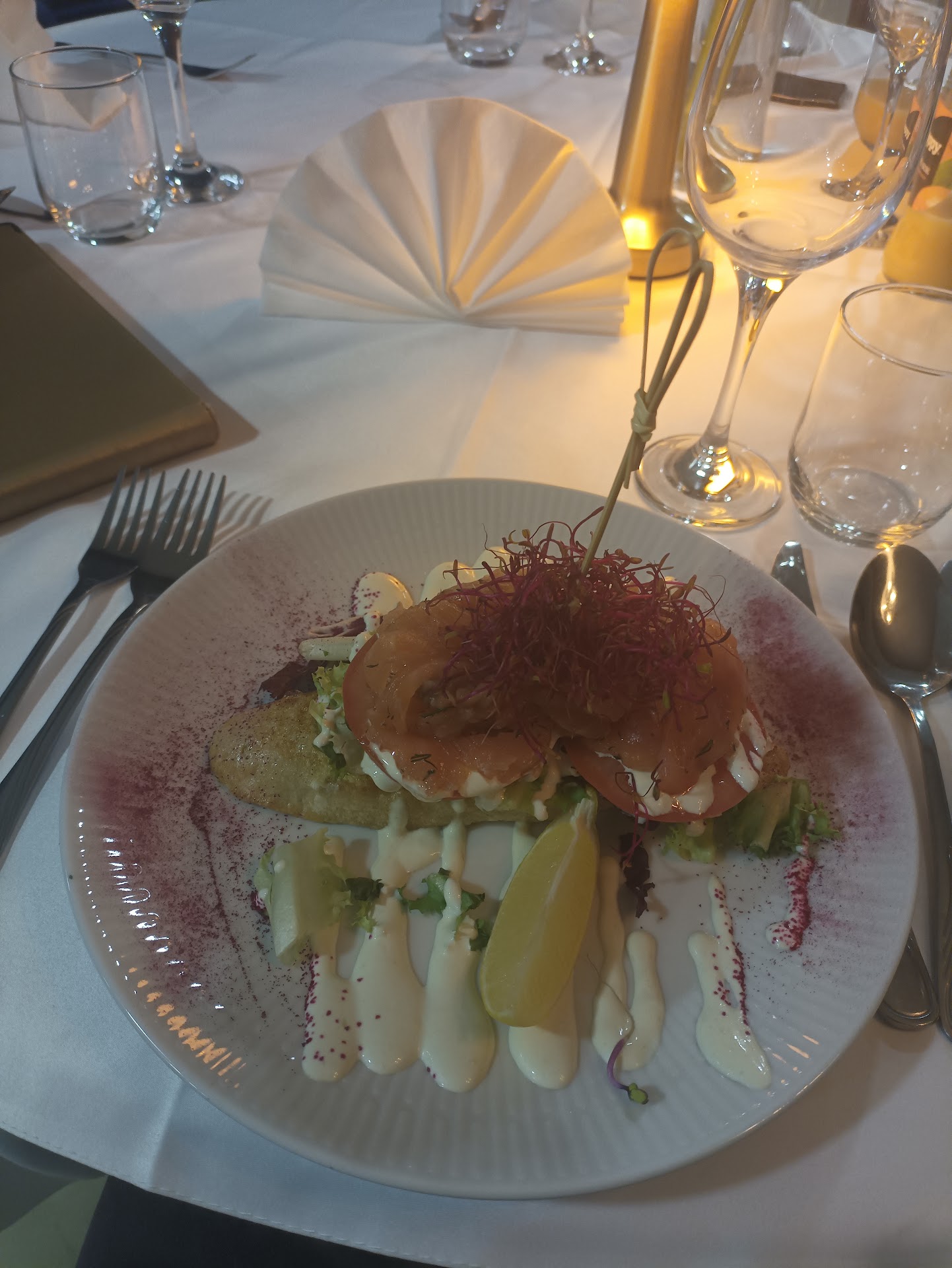 Read moreFirst and foremost, fantastic food! What you can see on photos is: Salmon carpaccio, fish soup, wild boar knuckle, duck brest and bananas with salty caramel for dessert. Out of these the dessert the dessert was nothing special but all the rest was top grade and on top of that, the portions were big (recently I noticed a tendency that good restaurants serve small meals - not the case here). If I can complain about anything it's that not everything from the menu was available but the stuff that we got was top notch and served fast. The waiter was a bit of a joker but I...