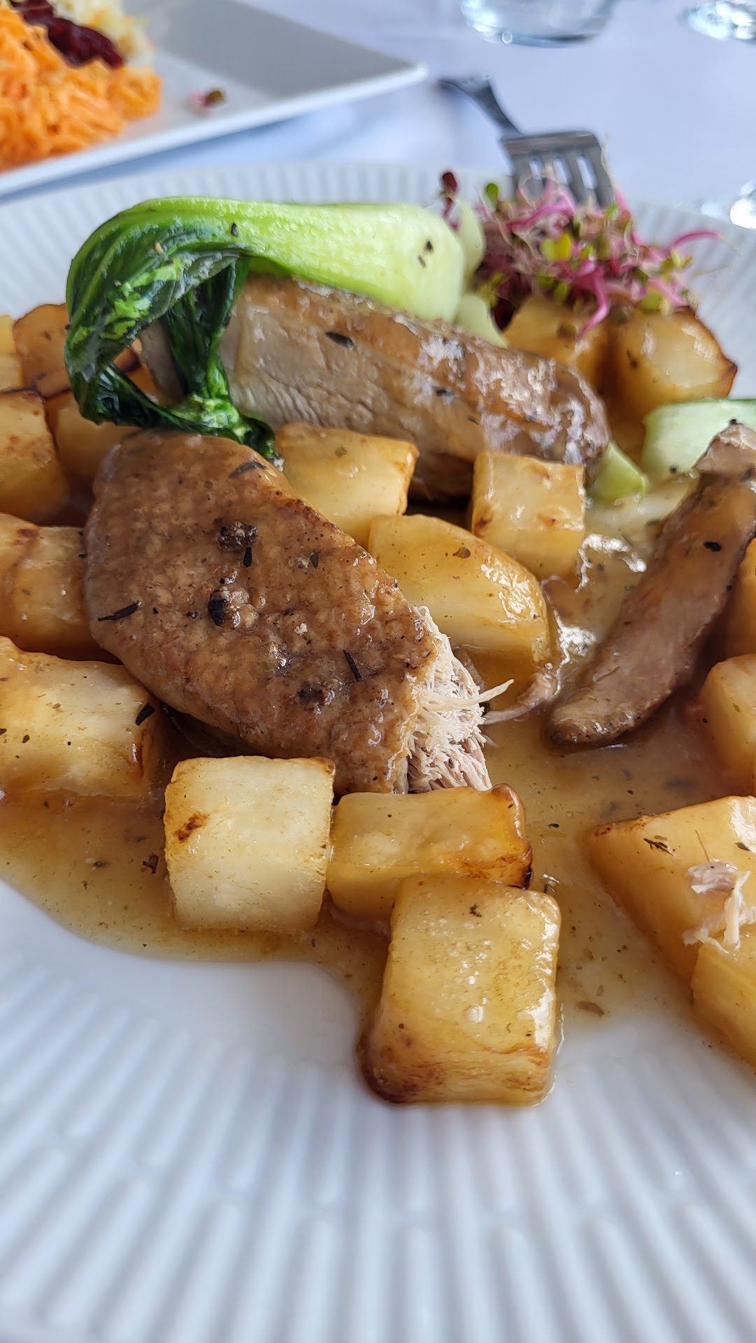 Na sali jest bardzo słaba wentylacja lub jej brak, co w dość ciepły dzień daje się we znaki. Sama restauracja ma elegancki wystrój i zapewnia ładny widok z okien. Wraz z rodziną zamówiliśmy kilka pozycji, ale niestety po około 10 min musieliśmy zmienić zamówienie, bo część dań nie była jeszcze gotowa (brak uwag w menu o konieczności wcześniejszego poinformowania o wyborze dań, a wizyta odbyła się o godzinie 16:00). Na jedzenie nie musieliśmy długo czekać. Zupa z podgrzybków była dobra i nie mieliśmy do niej uwag, jednak sałatka z rakami smakowała jedynie sokiem cytrynowym z nutą kolendry i została podana z mixem sałat jak z Biedronki. Może i ładna prezentacja, spora porcja, ale smaku brak. Po spożyciu połowy porcji czułem się jakbym zjadł pół cytryny. Na pochwałę zasługują mule, które były ładnie podane oraz dobrze przyrządzone, a przy tym ich porcja imponowała rozmiarem. Zamówiliśmy także piersi z kaczki, które nie zachwycały sposobem doprawienia i były za słodkie. Zostały podane wraz z karmelizowanym selerem, co razem tworzyło jednowymiarowe, przesłodzone danie. Bukiet surówek, jak w barze mlecznym. Przy zniżce -50% z Finebite ceny są adekwatne do jakości jedzenia. Jednakże w regularnej cenie dań głównych (ok. 60-80zł) można znaleźć w pobliżu zdecydowanie ciekawsze restauracje, a z pewnością...