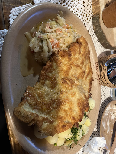 Sandacz smażony, który przyjaciółka wybrała sobie jeszcze w domu, oglądając menu w internecie, był zimny i bez smaku, z ziemniakami puree, które też były zimne i nijakie. Cieszyła się na to danie pół dnia, a zjadła odrobinę i poddała się 😔, a z jej talerza zjedliśmy nieco córka i ja, żeby przekonać się, że naprawdę jest to marność.