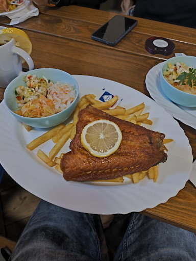 Read moreMała przyjemna knajpka zaraz przy plaży. Dookoła same wędzarnie i smażalnie ryb. Wnętrze małe ale przytulne oraz bardzo fajny klimat. Obsługa bardzo miła oraz wielki wybór menu (zwłaszcza ryb). Dania przygotowane w około 20 minut. Jedzenie bardzo dobre, ryba czuć że świerza i dobrze przyrządzona a frytki nie są spalone. Ceny nie są z kosmosu biorąc pod uwagę że to ryby. Sam lokal znajduje się przy kutrach rybackich...