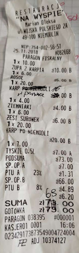 W niedzielę wybrałam się tam kolejny raz z synem. Co do obsługi, nic się nie zmieniło. Panie pracują, bo gdzieś muszą. Stoliki po "wybylych" gościach dluuugo nie posprzątane, trzeba się upomnieć o ogarnięcie stolika. Przy dużych cenach restauracyjnych, wypadałoby zamowienie przyjąć przy stoliku,.nie składać przy barze... Jedliśmy karpia w panierce, sandacza w zestawie i 1 rosół. Do picia 2 razy mała fanta. Koszt 190 zł. Dużo. Dania rybne pyszne, rosół jałowy, bez soli, trzeba doprawić. Później syn odmówił gruszkę na ciepło z lodami. O dostępności jest na Facebooku, w karcie nie ma, bo " dawno były drukowane, a nowych nie ma". Deser średni. I szkoda, że nie ma bukietu surówek. Poprosiłam o 3 surówki, myśląc, że to bukiet, czyli po trochę z każdej. Dostałam 3 pełne porcje; buraczki, marchew i kapusta biała. Koszt po 10 zł każda, więc 30 zł, tyle co...