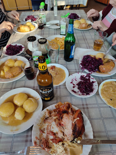 Read moreByliśmy na obiedzie w sobotę 24 sierpnia, wracając z V Międzynarodowej Wystawy Psów Rasowych w Rybniku-Kamieniu. W restauracji byliśmy na kilka minut przed otwarciem, tj. przed 12:00. Za dwie porcje: rolada, gumiklyjzy, modro kapusta i jeden żurek, jedno piwo, jeden sok z Tymbarku zapłaciliśmy... uwaga orkiestra tusz: 68,- zł, podczas gdy w jednej z sąsiednich restauracji jedna porcja śląskiego specjału j.w. kosztuje 62,- zł. Jeśli chodzi o smak to żurek był wspaniały, rolada (niestety wieprzowa) była O.K., kluski i kapusta bardzo O.K. Na roladę wołową musiałbym zaczekać do niedzieli... szkoda. Porcje duże, ledwo dałem radę a sporo potrafię zjeść. Na koniec sprawa wystroju. Czas się tu zatrzymał (późny Gomółka/wczesny Gierek a może wcześniej). Wystrój lokalu przypomniał mi trochę sceny knajpiane z filmu "Popiół i diament". Nie wszystkim się to spodoba ale ma to też swój urok. Bywalcy lokalu spędzający czas przy piwku (nie ma ich wielu) są zgrupowani w sąsiedniej sali. Do WC trzeba niestety wspiąć się po dość stromych schodach na piętro. Jak komuś spieszno, może nie zdążyć :). A i jeszcze jedna, dla nas bardzo ważna sprawa. Do lokalu zostaliśmy wpuszczeni z naszymi trzema Westami, mimo że są też miejsca pod parasolami na zewnątrz. W sobotę było +32 stopnie, w związku z czym wewnątrz lokalu było znacznie przyjemniej. Zatem należy stwierdzić, że lokal jest...