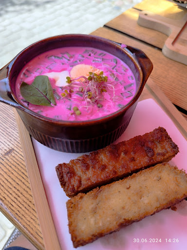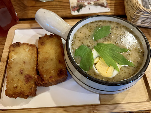 Read moreTo jest miejsce, które poleca się z ogromną przyjemnością. Wszystko zasługuje na wysoką ocenę. Od obsługi, która jest niesamowicie zorganizowana, przez pyszne jedzenie po klimat tego lokalu. Osobiście nie przepadam, za potrawami ziemniaczanymi i zazwyczaj tylko próbuje to co mąż zamówi, ale tutaj wszystko zjadłam ze smakiem. Zamówiliśmy dwa chodniki i zestaw na chrupiąco i do picia lemoniadę i podpiwek. Zacznę od lemoniady, mega cytrynowa, orzeźwiająca w upalny dzień. Podpiwek, taki jak pamiętam z dzieciństwa, który robiła moja babcia. Chłodnik z dodatkiem chrupiącej babki ziemniaczanej był przepyszny i bardzo sycący. Drugie danie wzięliśmy na spółkę(brak zdjęcia sugeruje, jak bardzo dopadliśmy do jedzenia). Był to zestaw na chrupiąco a w nim babka ziemniaczana, kartacz z mięsem, sos kurkowy, surówka w kiszonej kapusty i buraczki. Babka mega smaczna, chyba najlepsza jaką próbowałam w podlaskich restauracjach. Faktycznie chrupiąca, odpowiednio doprawiona, nie sucha, nie zbita, było czuć świeżość, PYSZNA! Kartacz bez szału, taki bez smaku, ale z dodatkiem tego sosu kurkowego się obronił. Sos kurkowy poezja smaku i było go bardzo dużo. Suróweczki bardzo smaczne. Jeśli ktoś lubi takie podlaskie specjały, to naprawdę warto odwiedzić to miejsce. Nie zrażajcie się kolejką do stolika. Obsługa ma to tak sprawnie zorganizowane, że naprawdę nie czeka się długo. Napewno...