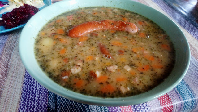 Read moreZachęcony dobrymi opiniami, (aktualnie 4,6) odwiedziłem karczmę u Ani. Jest to miejsce raczej z kategorii odwiedzić-zapomnieć. Panie obsługujące bardzo miłe, uśmiechnięte aczkolwiek zamówienia składasz przy ladzie ;) ale no dobra, zamówiona grochówka+devolay z pieczonymi ziemniakami. Pierwsze dostaliśmy surówki, następnie zupy. Dziwna kolejność ale dobra niech będzie. Sama grochówka w smaku smaczna, doprawiona. Ktoś miał fajny pomysł na "wkładkę" do zupy w postaci wrzucenia całej kiełbasy. No i możliwe, że to by się obroniło gdyby ta kielbasa była dobra, a nie była, odniosłem wrażenie że to najpodlejsza kiełba ever, także jak właściciele czytają to kiełba do wymiany albo nie dodawać jej wcale :p od razu człowiek się zastanawia czy reszta składników używanych w kuchni też jest "budżetowa". W zupie pływały jeszcze jakieś kawałki skór i o ile rozumiem ich używanie podczas gotowania zupy to na talerzu już tego wg mnie nie powinno być. Devolay dobry, ziemniaki ok, surówki pyszne. Niby można tu zjeść ale w dostawionym do budynku "namiocie" jest duszno i lata duża ilość much co powoduje, że jedyne o czym się myśli to zjeść jak...
