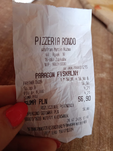 Read morePizza zamówiona z odbiorem na wynos. Została przygotowana 17 minut wcześniej, o czym nie zostałam poinformowana. Wolałabym poczekać te 10-15 minut dłużej, a otrzymać DOPIECZONĄ pizze. Surowe ciasto z zakalcem, mokra i rozpadająca się pizza, składników tyle co kot napłakał. Zdarzało się to już wcześniej, jednak dałam szansę- nie warto. Pizzeria niskich lotów, kucharz chyba nie widzi tego, co wydaje na serwis, a dalej obsługa nie weryfikuje co podaje gościom. Nie polecam i było to moje ostatnie złożone zamówienie, kasa w błoto, pizza pójdzie niestety do wyrzucenia- zakalcem...