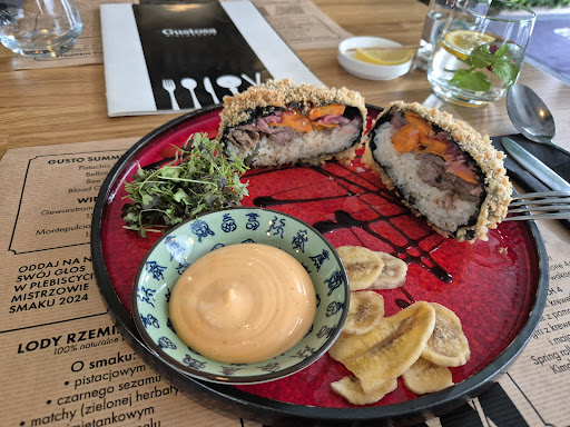 From time to time I'm in Kalisz on business and today my colleague recommended me Gustosa. She told me it was an Italian restaurant with sushi 🍣 and I was a bit skeptical about this combination... but I must say I am glad I trusted my colleague and went for lunch. I ordered sushi beef burger... and it was a very tasty and an unexpected mix. Definitely worth trying. Today I also felt like trying some dessert and order the apple pie... and it was an excellent way to get ready for the road back home. There are so many more interesting options in the menu that I must still try that I am coming back for sure next time...