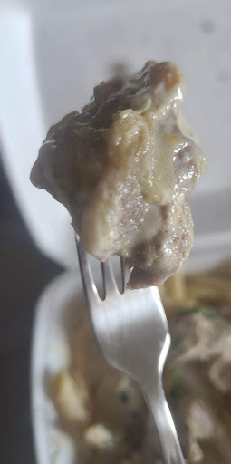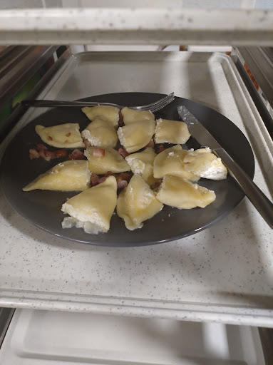 Beton, beton, beton, bo zachciało się wyciąć wszystkie drzewa i krzewy, które tam wspaniale rosły. Okna się nie otwierają, klimatyzacja jest i działa - jakieś 5 cm od klimatyzatora. A więc: na zewnątrz smród spalin i gorąco od betonu, wewnątrz duszno, parno, z bardzo nieprzyjemnym zapachem pomieszczenia niewietrzonego. Z żalem też stwierdzamy: pierwszy raz w życiu jedliśmy niesmaczne pielmieni (ciasto w porządku, choć nieco za długo gotowane, ale za farsz robi zbita kula twardego mięsa o dziwnym smaku /Magii? Jakieś knory?/). Nie polecamy, tym bardziej, że to NIE pielmieni, to coś miało udawać gruzińskie chinkali. I kształt się zgadza, farsz daleko odbiega. Bez sensu! Z żalem, bo obsługa się stara, ale... nie przecież wystarczy się starać, trzeba jeszcze umieć prowadzić bar, zorganizować obsługę i...