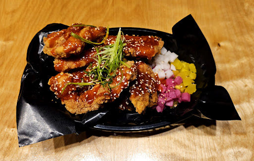 Pierwsza wizyta. Na start tteokbokki - idealna ilość na przystawkę. Mimo, że zaznaczone jako danie ostre, takie nie były. Następnie Spicy Yang ze szczyptą cynamonu. Możliwość wyboru opcji ostrości (1-5). Dla nas 2 było idealnie pikantne, nie zabijając smaku potrawy. Później absolutny hit sweet wasabi. Kurczak w słodkim posmaku z pudrem wasabi. Ostrość przechodzi od razu do zatoki i nosa, bez uczucia pieczenia w gardle. Przyjemny dodatek w postaci rzodkiewki do przegryzienia. Całość dopełniła lemoniada yuzu, która okazała się strzałem w 10. Na plus możliwość wybrania stripsów/ udka/ kalafiora. Porcje bardzo duże, wzięliśmy do domu na wynos. Odgrzane nie straciły dużo na jakości. Jeżeli decydujecie się na same kurczaki, bez dodatków to dobra opcja do dzielenia na dwie osoby.