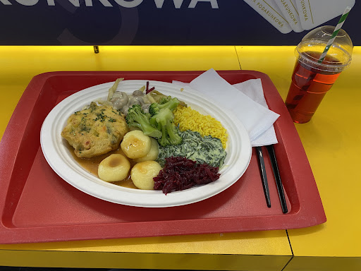 Czy na miejscu czy na wynos- jedzenie zawsze jest po prostu wspaniałe, obsługa w obu przypadkach bardzo miła i profesjonalna. Kluski z mięsem, kotlet mielony świetne, sałatka z brokuła mistrzostwo, kompot też bardzo dobry, próbowałam wielu rzeczy i nigdy się nie zawiodłam. Raz w sałatce z brokuła na dowóz trafił mi się w środku włos, pierwszy raz w życiu miałam taką sytuację, nie wiem na jakim etapie się tam znalazł, nie zmienił mojej sympatii do miejsca, ale piszę bo może uda się coś zaradzić w tej kwestii na przyszłość. Natomiast tam pracują osoby, które naprawdę się znają na gotowaniu i nie boją się nadawać...
