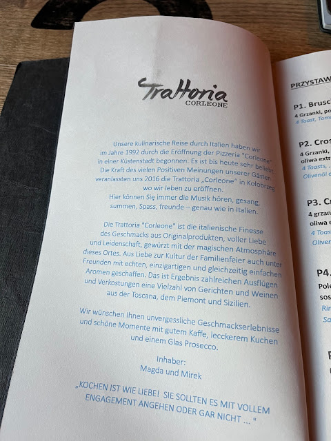 Am dritten Tag in Kolberg/Kołobrzeg, verschlug es uns nach dem Tagesprogramm nochmals an den Hafen. Wir waren vorher in Bialogard. Etwas ernüchtert von der, sorry, langweiligen Stadt und mit Hunger im Bauch, kehrten wir in die Trattoria Corleone ein. Von außen, für einen kurzem Blick wirkt es unisperierend. Doch bitte Leute, schaut richtig hin und vor allem rein. Ein wirklich liebevoll eingerichtetes kleines Kleinod. Die Trattoria besteht schon 2016 und die Gründer beschreiben ihr Thema mit folgenden Worten: