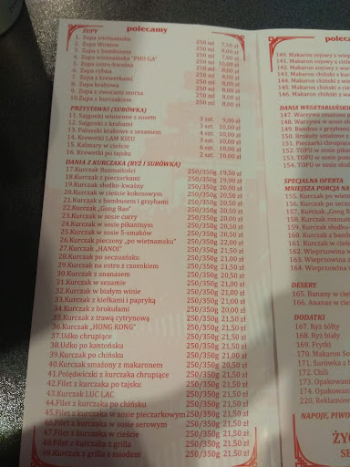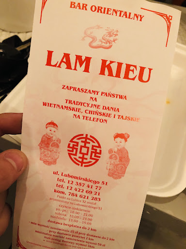 Read moreRaczej pisze negatywne opinie, bo tylko na takie znajduje w sobie chęć i energię. Ale dzisiaj święto, Lam Kieu zamknięte i wybraliśmy się do innej restauracji orientalnej w Krakowie. Po tej wizycie stwierdzam, że LK to prawdziwa kuchnia wschodu. Minus jeden wielki jest taki, że nie ma ogródka i zapach w restauracji przenika ubranie. Ale zupa won ton, polędwiczki chrupiące i sałatka mega super. Mega super. Tak w sumie to dobrze że nie ma ogródka bo spasł bym się jak wieprzowina pięciu smaków. Obsługa. No kiedyś była miła młoda dziewczyna a teraz jest Pani faktycznie nieco w opozycji do klienta. No ale ja chodzę tam jeść, nie uśmiechać się. Wystrój. No klienta lub partnera biznesowego raczej bym tu nie zabrał. No ale znam przypadek kiedy manager z korpo który przyleciał z Gdańska chciał na prawdziwego schabowego z ziemniaczkami i zabrali go do trola na placu imbramowskim. W sumie to spoko, bez fajerwerków. Jeżeli chcesz oprócz pysznego jedzenia obsługę na najwyższym poziomie i lokal ellegance to idź na sushi na ul. Tomasza, ale nie zapomnij karty służbowej, bo na swojej nie masz...