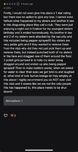 Read moreas someone who has been living in krakow for 2 years as a student, iâve tried out a lot of the local clubs and i can say that the staff here is the rudest in town. ok the drinks r cheap but pls. for the love of god, go anywhere else. last night i went with some friends and left my coat at coat check and when i handed the women back my bracelets (2, 1 for purse 1 for coat ) they only handed me my purse (1/2). i definitely gave them my jacket bracelet but they did not believe me, i was not drunk at all, and yet these women were so mean and disrespectful, laughing at my frustration instead of helping. the bouncers did nothing but told us we were stupid and they didnât care. in the end, as i am sitting on this floor in tears, they finally realize they indeed messed up and gave me my coat after realizing she had put the bracelet on the wrong hook but instead of apologizing they acted like we were the issue. we knew the brand name, we showed many pictures of me in that jacket, but they wouldnât even try to take a second glance. if she had just looked again it would have been fine. the disrespect was insane. iâve been to this club numerous times and have loved it so to have this experience just sucks. the vibe is good, the music is great, but this made me hate it. like i get it, itâs late everyoneâs hammered n u j wanna go home but it was their job. not mine. and their mistake was not the issue, their poor ability to act as decent humans was. like just say iâm sorry and itâs all good! also i have a brace on my wrist as i broke it and had surgery less than a month ago and the security woman who was of course useless hit it hard and did not apologize, yet again trying to claim it was my fault. somehow i spend 4 hours on the dance floor and no one hit my wrist but the people in charge of our safety do. sometimes iâm sorry goes a long way, and last night it would definitely have. like i said, especially as a woman, DO...