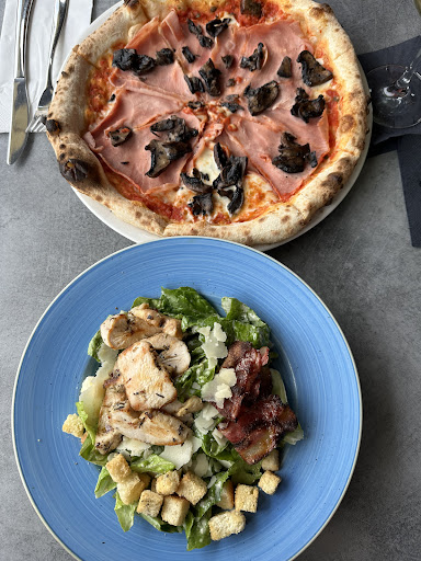 The food was excellent, and the ambiance of the place was pleasant. However, the service was a letdown, especially considering it was included in the bill. We found ourselves waiting by a dirty table, witnessing a waitress serving water to a dog and delivering drinks to other guests without acknowledging our presence. When she finally cleared the dirty dishes from the previous guests, she neglected to clean the table properly, merely placing menus on top of the remaining dirt and grease. Politely requesting her to clean the table resulted in an unfriendly response, and she begrudgingly cleaned it, allowing us to finally sit.