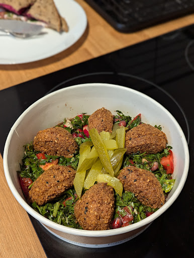 Falafel itself really nice, but was the smaller part of the salad I had. The salad doesn't even come with hummus and the staff deemed unwilling to add any extras or change what's in the options. Staff were both surly and seemed frustrated by me, despite being the only customer present.