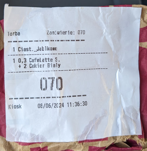 Pomijam już jakość przygotowanej kawy, bo o mleku bez laktozy (jak i w ogole mleku) to mozna tak zapomnieć... Komuś się tam ewidentnie pomyliło i zrobił mi kawę czarną, co zauwazylam dopiero w czasie trasy powrotnej do mieszkania niestety...
