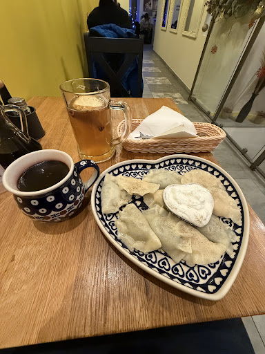 We just arrived in Krakow, and this is the first place we went to. It wasn't hard to make a decision because this place looked incredible on google maps! I am so happy we came here. We were immediately greeted by friendly English-speaking staff. The menu is fully translated, and the options are amazing. It's a must try if you want to experience traditional Polish dumplings. Their fillings are very varied with lots of flavours for every taste! It's impossible not to find something that you like. In the picture, you can see their mixed variety option. I love that you can mix and match the options if you don't want to be limited to just one option at a time. They were delicious! The filling is suuuper tasty, well-cooked, and the aromas just melt in your mouth. The serving is very big and the price is super fair. The restaurant is intimate and cosy, and it doesn't feel too crowded. I also loved the plates. Super adorable and traditional at the same time.
